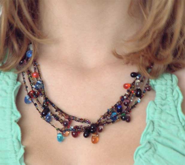 colourful glass beads on black crocheted thread