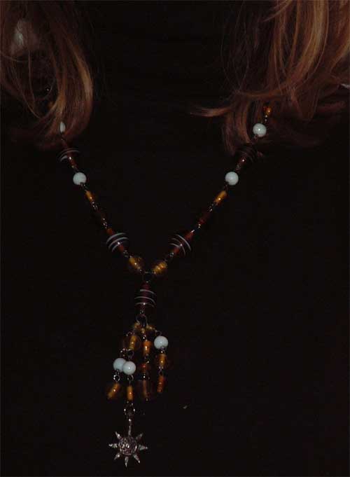 amber glass with white acents and metal links
