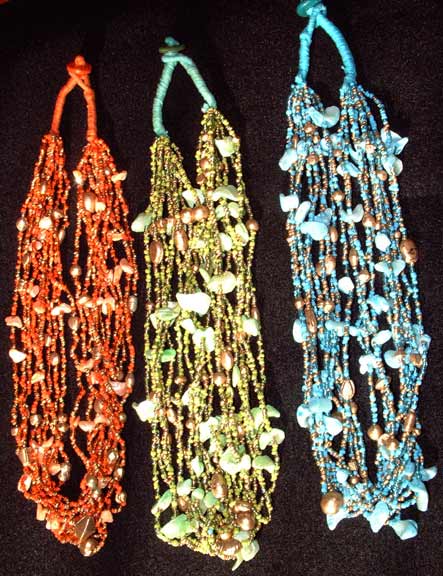 multi-strands of beads with irregular-shaped shell and gold beads available in pink, orange, green, blue and black/grey