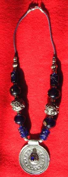 blue glass, and silver beads on leather with silver medalian